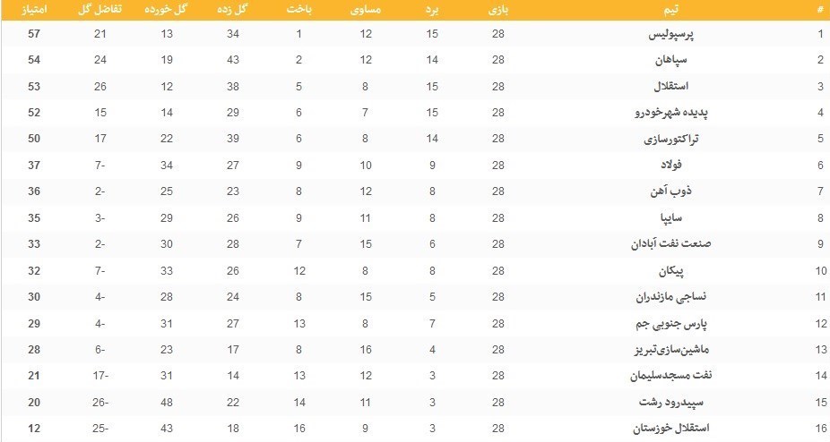 نتایج دیدارهای برگزارشده هفته بیستوهشتم لیگ برتر: