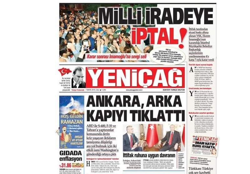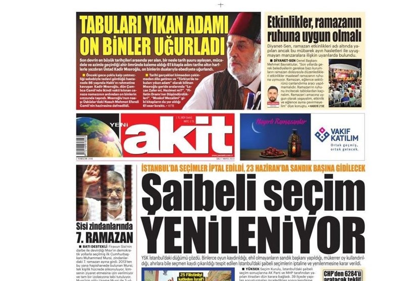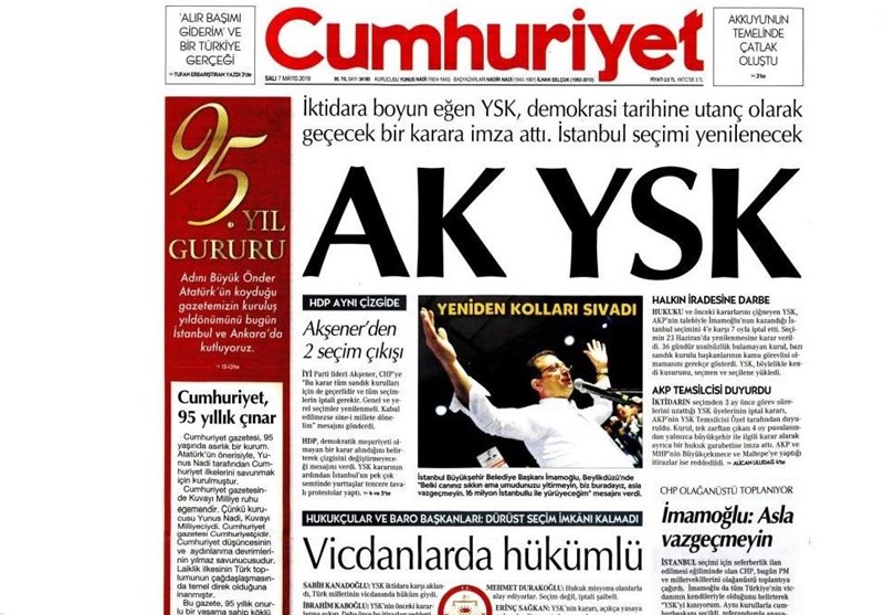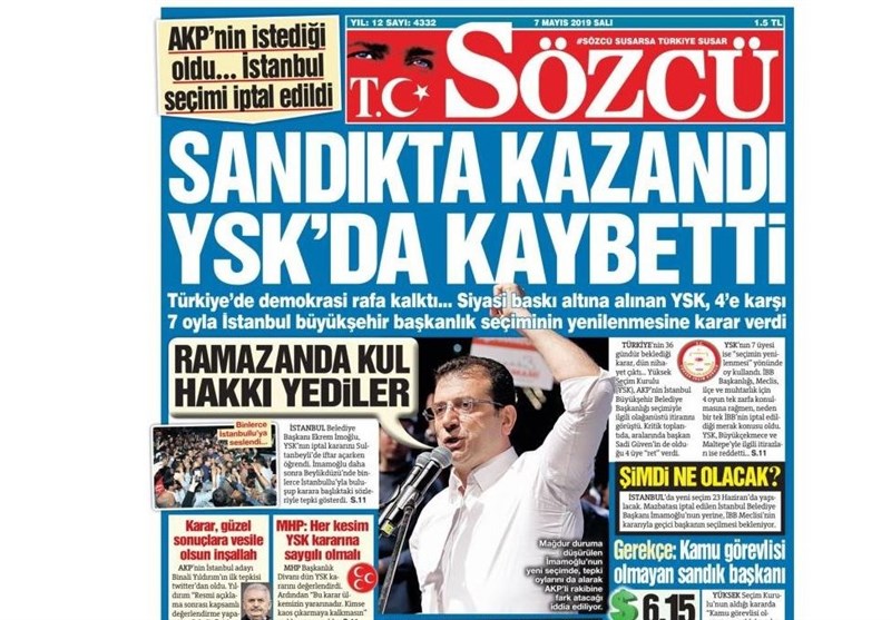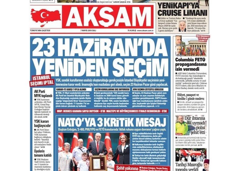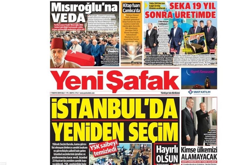 به گزارش گروه بین‌الملل خبرگزاری تسنیم، بسیاری از روزنامه‌های ترکیه، امروز در عکس و تیتر صفحه نخست، حکم نهاد عالی انتخابات مبنی بر برگزاری مجدد انتخابات در استانبول را برجسته کرده‌اند. همچنین این روزنامه‌ها موضوعات دیگری مانند تشییع جنازه مورخ منتقد آتاتورک یعنی مصر اوغلو را مورد توجه قرار داده‌اند.