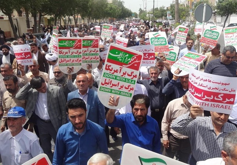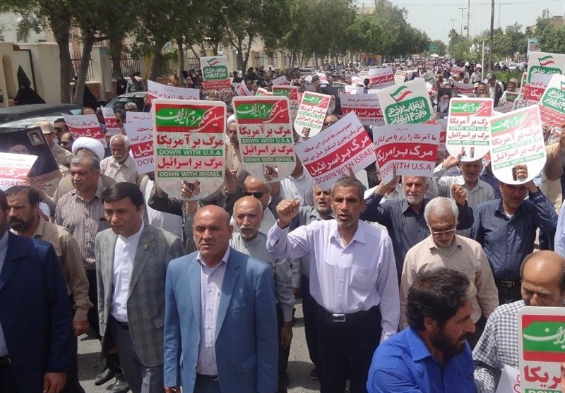 روزهداران بوشهری در این راهپیمایی که از مصلای جمعه تا میدان قدس بوشهر برگزار شد با سر دادن شعارهای مرگ بر آمریکا، مرگ بر اسرائیل، مرگ بر آلسعود، ای رهبر آزاده آمادهایم آماده، مسیر راهپیمایی را طی کردند.