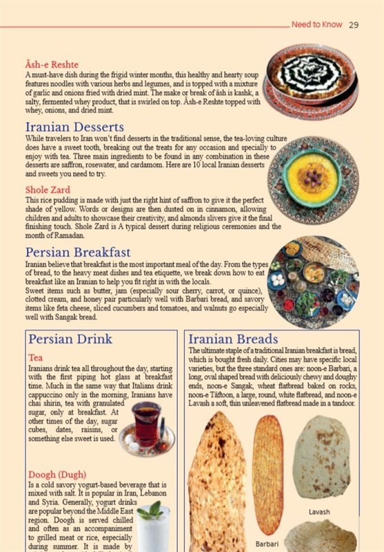 در بخش دوم این فصل نیز با ارائه اطلاعات مورد توجه علاقمندان و گردشگران خارجی در مورد ایران، همانند جغرافیا و شرایط جوی این کشور، تاریخ، فرهنگ و رویدادهای مهم فرهنگی، پوشش ایرانیان در طول تاریخ، مردمان و گروه‌های قومی، جمعیت شناسی مذهب، سیاست و سلسله‌های حاکم، رویدادهای مهم سیاسی و فرهنگی، اقتصاد، ادبیات غنی و شعرا و نویسندگان شهیر ایرانی معرفی کتب ممتاز ایران، هنر، موسیقی، سینما و تئاتر، سبکهای معماری ایرانی، شهرها، طبیعت، گونه‌های گیاهی و جانوری منحصر به فرد ایران ورزش در ایران و حمل و نقل تلاش شده تا خلاهای موجود در زمینه شناخت ایران تا حد زیادی مرتفع شوند.