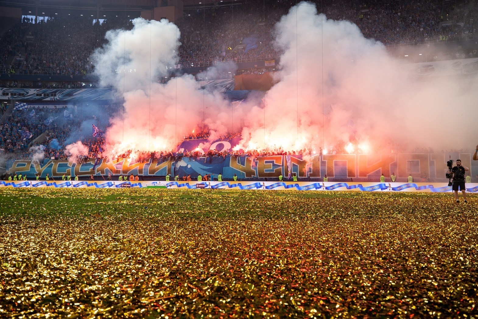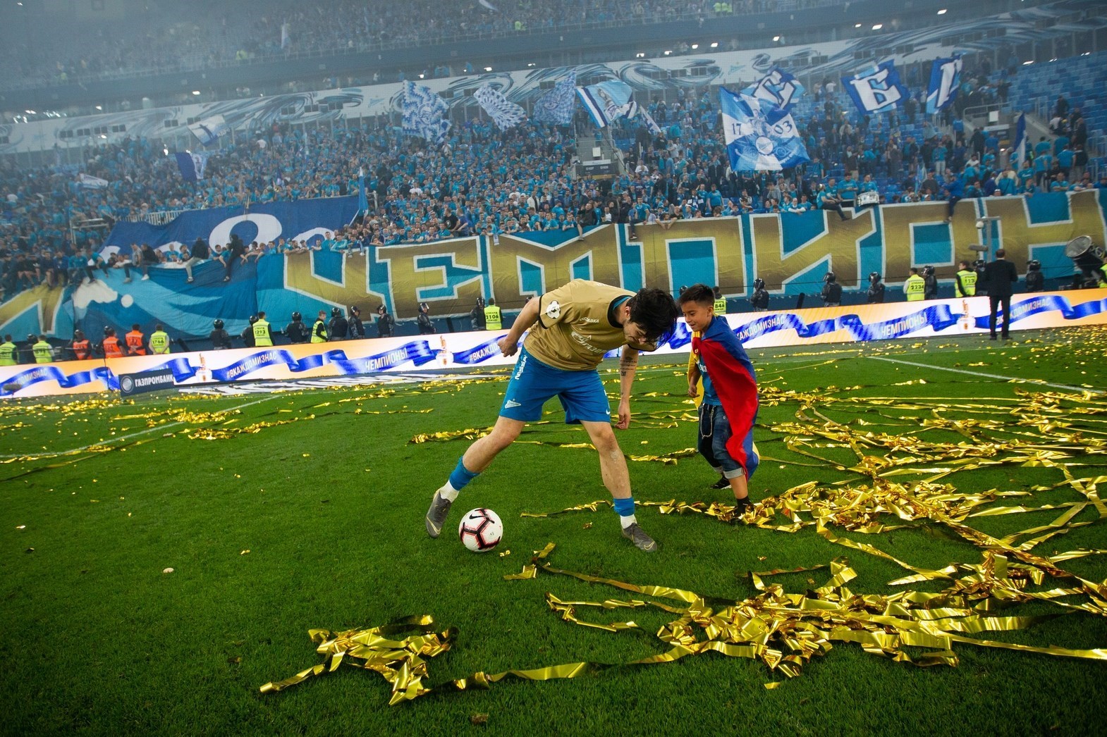 تصاویری از جشن باشکوه قهرمانی تیم زنیت در ورزشگاه گاز پروم جزیره کرستوفسکی سن‌پترزبورگ را مشاهده می‌کنید: