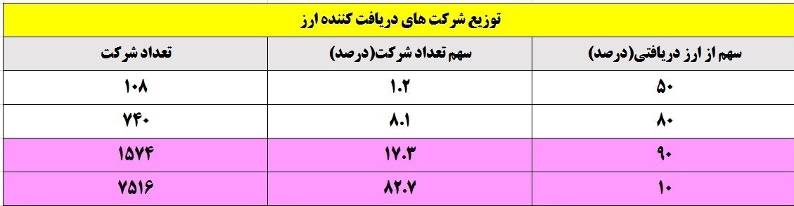 جدول زیر، نسبت سهم ارز دولتی دریافتی شرکتها را نشان میدهد. توصیف اعداد جدول به این ترتیب است: تنها 108 شرکت (از مجموع 9090) شرکت دریافتکننده ارز دولتی 4200تومانی، 50 درصد کل ارزهای اختصاص دادهشده را دریافت کردهاند. اگر دایره شرکتها را کمی بازتر بگیریم، 740 شرکت اول، حدود 80 درصد، و در مرحله بعدی 1574 شرکت، 90 درصد ارزهای دولتی را دریافت کردهاند. به 7516 شرکت انتهایی جدول، مجموعاً تنها 10 درصد ارزهای دولتی اختصاص داده شده است.