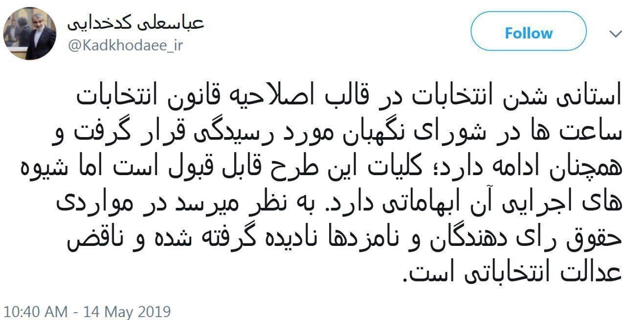 حالا، عباسعلی کدخدایی سخنگوی شورای نگهبان نیز با انتشار مطلبی در صفحه شخصیاش در فضای مجازی نسبت به این طرح اظهارنظر کرده است.