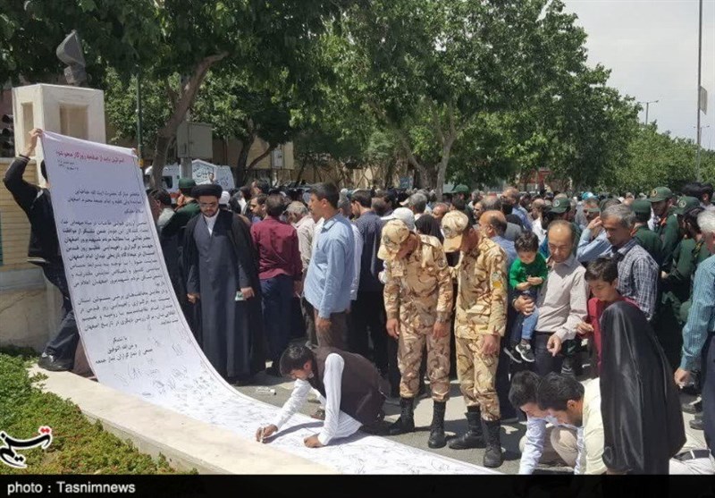 در همین راستا نمازگزاران اصفهانی نیز که موافق نظر امام جمعه اصفهان در برگزاری راهپیمایی روز قدس در میدان امام (ره) هستند با امضای طوماری حمایت خود از تصمیم آیتالله طباطبایی نژاد را اعلام کردند.