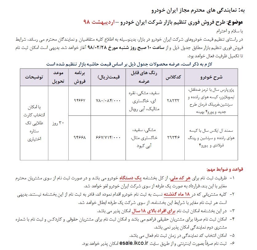 ایران خودرو شرایط فروش فوری دو محصول خود را برای تنظیم بازار اعلام کرد.