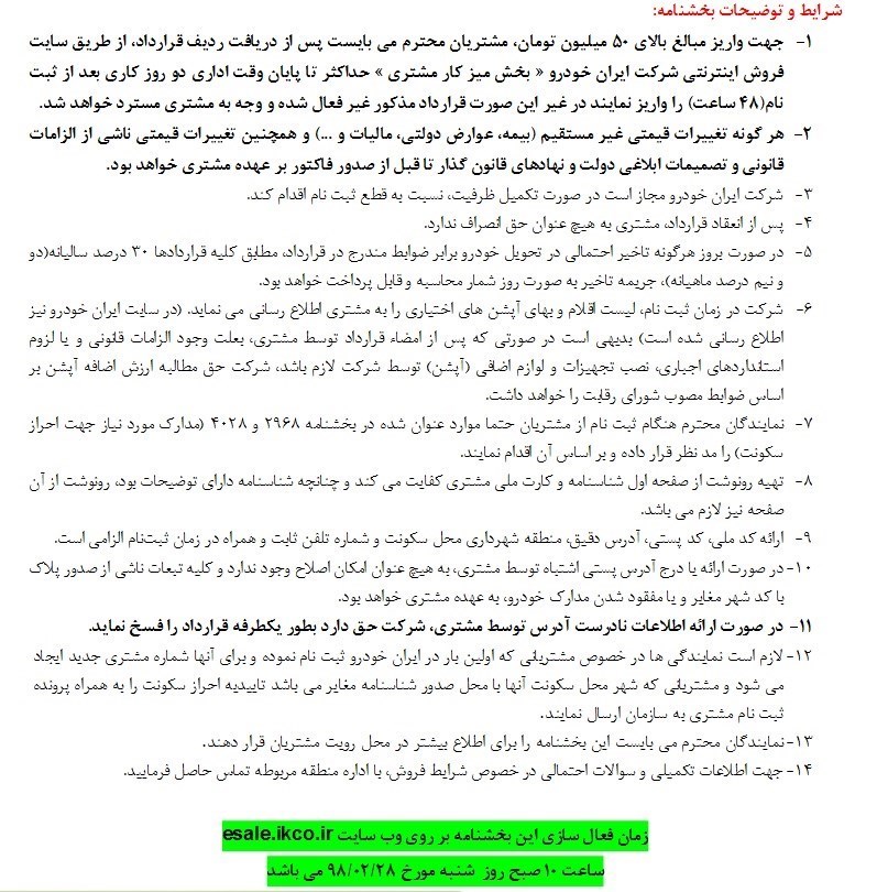 درضوابط فروش این طرح ظرفیت ثبت نام برای هر کد ملی از کل بخشنامه یک عدد خودرو است و اگر ثبت نام از سوی مشتریان مغایر با این بند قرارداد باشد به صورت یکطرفه از سوی شرکت ایران خودرو لغو خواهد شد. همچنین کلیه مشتریانی که در 18 ماه گذشته نسبت به ثبت نام خود اقدام نموده اند قادر به ثبت نام از این بخشنامه نیستند. البته هر ثبت نام مغایر با شرایط این بخشنامه از سوی شکل یک طرف ابطال خواهد شد در این بخشنامه امکان ثبت نام برای افراد بالای 18 سال امکانپذیر است.
