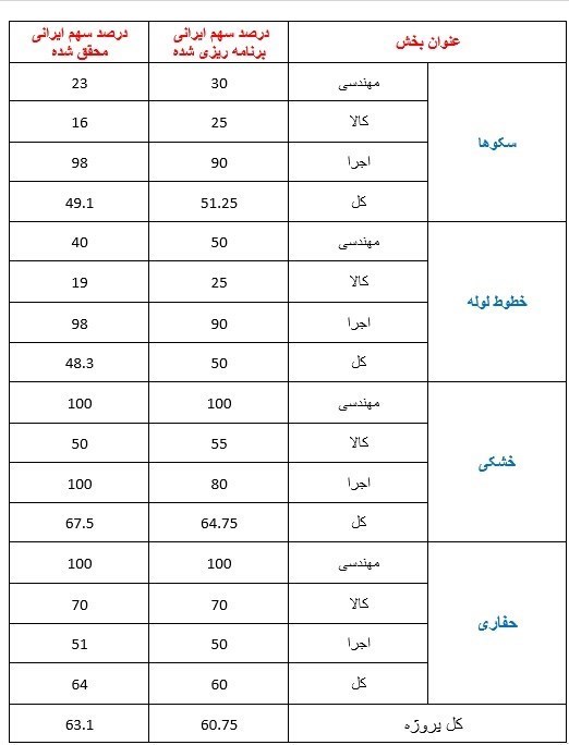 جزئیات سهم استفاده از توان و ظرفیت‌های ایرانی در توسعه فازهای 22، 23 و 24 پارس جنوبی در جدول زیر آورده شده است.