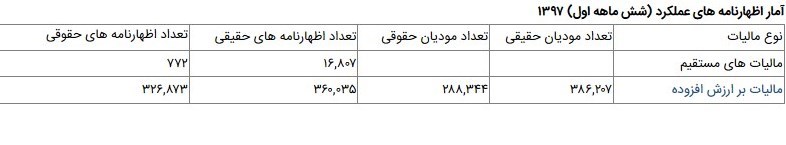 بر این اساس تعداد کل اظهارنامه های حقیقی مالیات ارزش افزوده در مدت مورد اشاره حدود 360 هزار و تعداد اظهارنامههای حقوقی بیش از 326 هزار عدد بوده است.