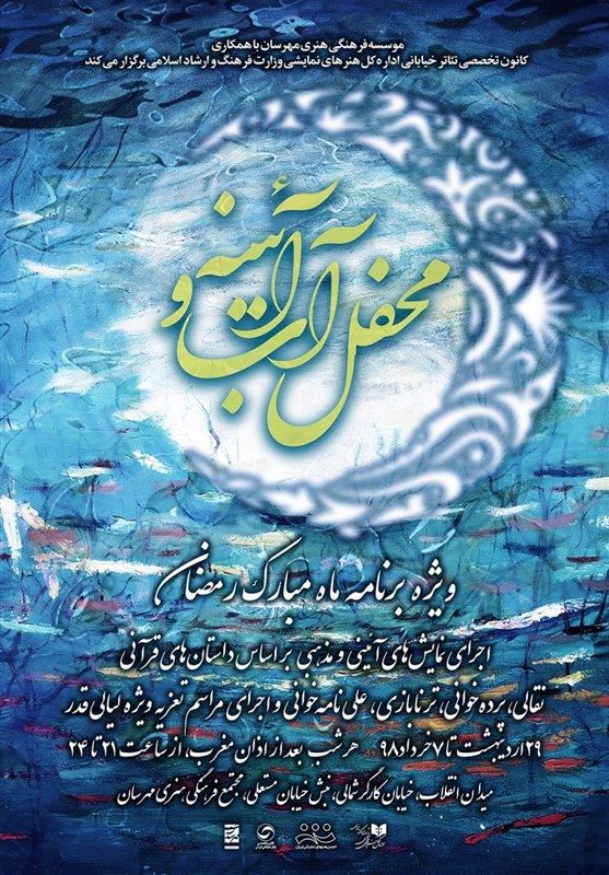 این برنامه که تحت عنوان «محفل آب و آینه» برگزار میشود شامل نمایشهایی خیابانى برگرفته از داستانهاى قرآنى، ترنا بازى و آیینهاى نمایشى، نقالى، پردهخوانى ،علىنامه خوانى و اجراى تعزیه در ایام شبهاى قدر است.