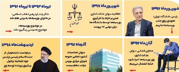 دانشجویان شکایت خود را در پنج حوزه و سطح مختلف مطرح کردند و در انتظار پیگیری دیوان عدالت اداری و دادگاه فرهنگ و رسانه هستند. احکام بدوی و مرحله تجدیدنظر دیوان عدالت اداری برای تعدادی از دانشجویان شاکی پرونده صادر شد. عباس محدث، معاون قضایی امور اداری- استخدامی دیوان عدالت اداری، آبانماه 97 از صدور 72 رای قطعی خبر داده و گفته بود: «درصورت عدماجرای این احکام، حکم انفصال از خدمت در انتظار روسای متخلف از رای دیوان است، اما با وجود گذشت 6 ماه، نه حکم انفصال از خدمتی صادر و نه پرونده بورسیهها بسته شد.» محدث درخصوص آخرین وضعیت بورسیهها میگوید: «پرونده کسانی را که به ما مراجعه میکردند، پیگیری کردیم و هماکنون درحال اجراست.»
