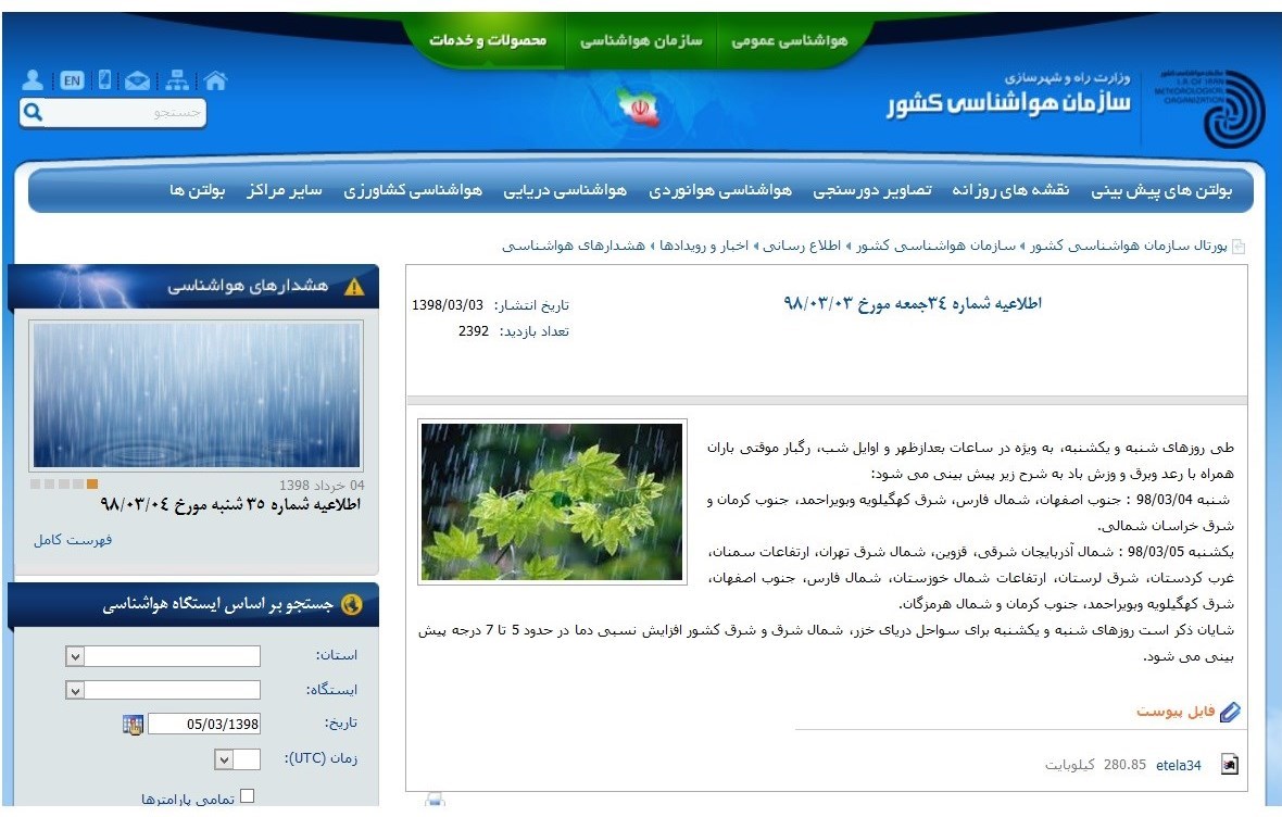 «پیرو اطلاعیه شماره 34 جمعه مورخ 98/03/03، طی روزهای شنبه و یکشنبه، بهویژه در ساعات بعدازظهر و اوایل شب، رگبار موقتی باران همراه با رعد و برق و وزش باد بهشرح زیر پیشبینی میشود: