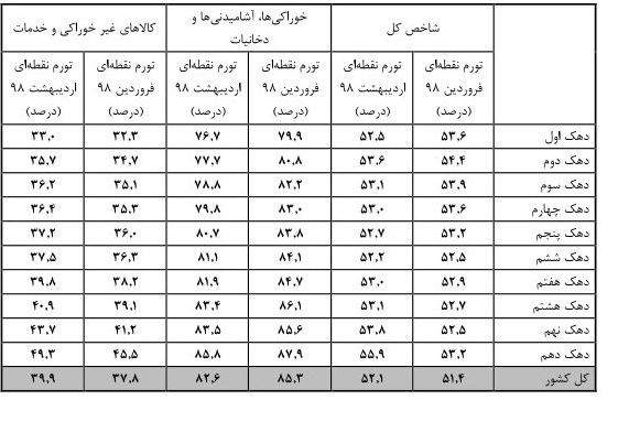 به گزارش خبرنگار اقتصادی خبرگزاری تسنیم، نرخ تورم کل کشور در اردیبهشت ماه ١٣٩٨ برابر ٣٤,٢درصد است که در دهکهای مختلف هزینهای در بازه ٣٣.٧درصد برای دهک اول تا ٣٦.٦درصد برای دهک دهم نوسان دارد. محدوده تغییرات تورم دوازده ماهه در گروه عمده «خوراکیها، آشامیدنیها و دخانیات» بین ٤٧.٣درصد برای دهک اول تا ٥٢.٤درصد برای دهک دهم است. هم چنین اطلاع مذکور در مورد گروه عمده «کالاهای غیر خوراکی و خدمات» بین 23درصد برای دهک اول تا ٣٣.٢درصد برای دهک دهم است.