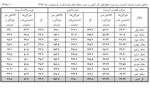 شاخص قیمت مصرفکننده و تورم سالیانه خانوارهای کل کشور بر حسب دهکها در جدول زیر قابل مشاهده است.