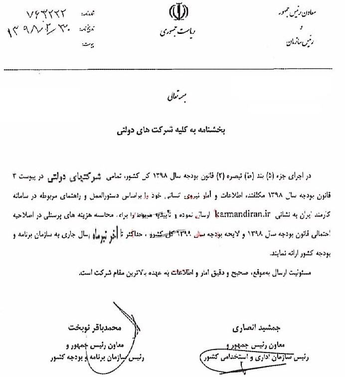 در ادامه این بخشنامه آمده است شرکتهای دولتی بایستی با توجه به اصلاحیه احتمالی قانون بودجه 98 و لایحه بودجه 99 در خصوص ارائه تأییدیه مربوط به محاسبه هزینههای پرسنلی حداکثر تا پایان تیر ماه اقدام نمایند.