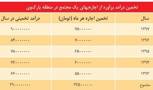 اگر قیمت اجاره واقعی این مجتمع را بهصورت ماهانه و با توجه به نوسانات اخیر بازار مسکن همین 75 تا 110 میلیون تومان تخمین زد و از سوی دیگر نرخ تورم و درصد افزایش اجارهبها با قیمت اجاره یک مجتمع با امکانات این ساختمان طی پنج سال گذشته در این منطقه را مورد حسابرسی قرار داد، میتوان به یک عدد قابل توجه دست یافت.