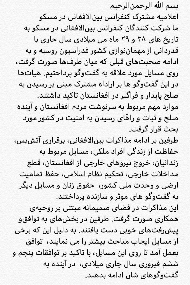 در این بیانیه آمده است که در نشست بینالافغانی طالبان و هیئت افغان، که نمایندگان دولت افغانستان در آن حضور نداشتند، درباره صلح پایدار، موارد مهم مربوط به سرنوشت مردم و آینده صلح و ثبات و راههای برقراری امنیت بحث شده است.