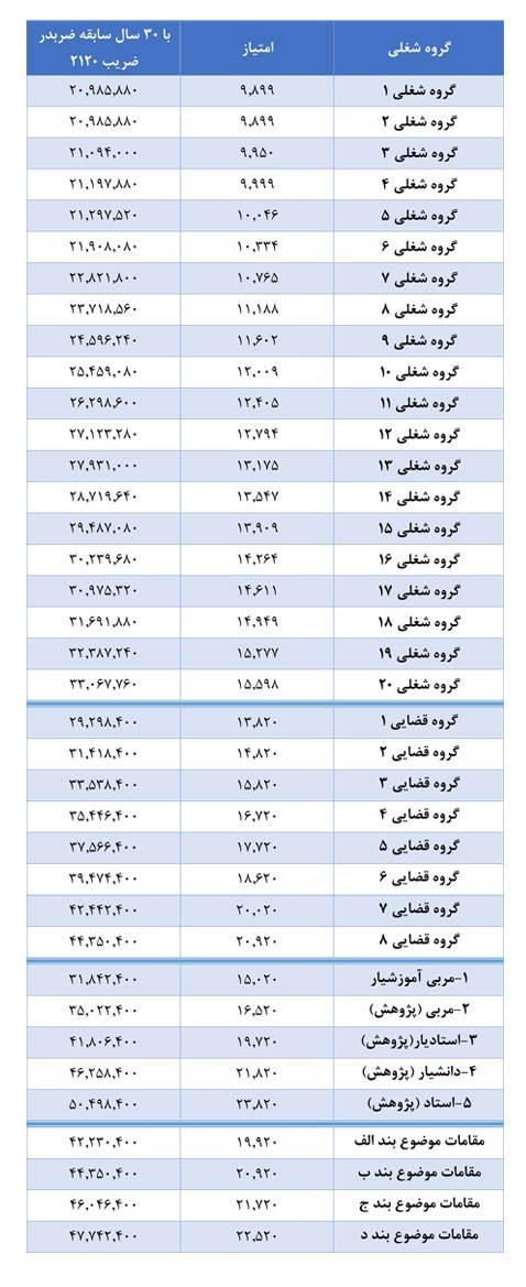 در این جدول امتیازات مشترکین صندوق بازنشستگی کشوری در چهار گروه شغلی یعنی گروه 20گانه شغلی، گروه 8گانه قضات، پنجگانه هیئت علمی و همچنین گروه مقامات ذکر شده است. براساس ضوابط و قوانین موجود و همچنین جدول همسانسازی و گروههای شغلی ذکرشده در بالا، روش محاسبه حقوق بهصورت زیر خواهد بود: