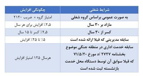 تعدادی از حقوقبگیران نیز که بهلحاظ سنوات کمتر از 30 سال (معمولاً کمتر از 15 سال) بهعلت فوت یا ازکارافتادگی مشمول دریافت حقوق شدهاند با توجه به شرایط تعریفشده در مواد 109 و 110 قانون مدیریت خدمات کشوری و قلت سنوات حقوق آنها، براساس سنوات برقرار شده که در محاسبه، این افزایش مشمول 18 درصد و حداقل حقوق 15.875.000 ریال شده است.