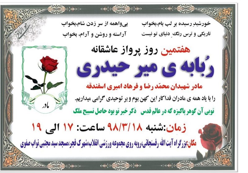 مراسمِ یادبودِ مرحومه ربابه میرحیدری مادرِ مکرمه شهیدانِ بزرگوار فرهاد و محمدرضا امیریاسفندقه و همچنین شاعرِ گرامی جناب آقای مرتضی امیریاسفندقه در روز شنبه هجدهم خرداد ماه از ساعت 17 الی 19 در مسجد شهید سیدمجتبی نواب صفوی برگزار میگردد.