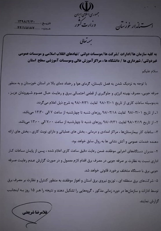 به گزارش خبرگزاری تسنیم از اهواز، بنابر اطلاعیه استانداری خوزستان از فردا 19 خردادماه ساعت اداری ادارات استان خوزستان نیم ساعت کاهش پیدا میکند.