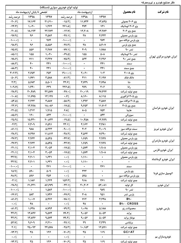 مطابق این آمار در اردیبهشت ماه امسال تولید ایران خودرو در خودروهای پژو پارس دو گانه سوز و سمند نسبت به مدت مشابهه در سال گذشته متوقف شده است. همچنین تولید تندر ٩٠ شرکت پارس خودرو، تیبا دوگانه سوز نیز به صفر رسیده است.