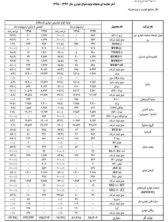در این آمار تولید انواع خودرو در شرکت ایرانخودرو در مقایسه با اردیبشهت 97 کاهش54.0 درصدی و تولید سایپا کاهش 0.7 درصدی داشته است.