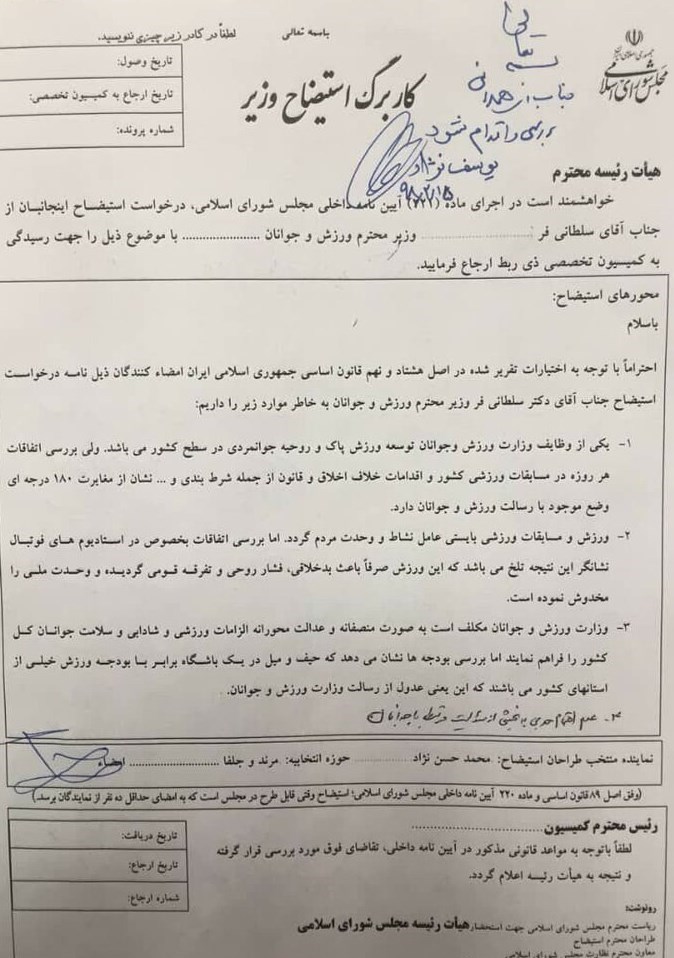 متن کامل استیضاح مسعود سلطانیفر به شرح زیر است: