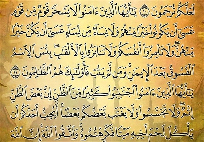 یکی از این آیات اخلاقی مربوط به آیه11 سوره حجرات است. خداوند در این آیه میفرماید: «یَأَیُّهَا ٱلَّذِینَ ءَامَنُوا۟ لَا یَسْخَرْ قَوْمٌ مِّن قَوْمٍ عَسَىٰٓ أَن یَکُونُوا۟ خَیْرًا مِّنْهُمْ وَلَا نِسَآءٌ مِّن نِّسَآءٍ عَسَىٰٓ أَن یَکُنَّ خَیْرًۭا مِّنْهُنَّ ۖ وَلَا تَلْمِزُوٓا۟ أَنفُسَکُمْ وَ لَا تَنَابَزُوا۟ بِٱلْأَلْقَٰبِ ۖ بِئْسَ ٱلِٱسْمُ ٱلْفُسُوقُ بَعْدَ ٱلْإِیمَٰنِ ۚ وَ مَن لَّمْ یَتُبْ فَأُو۟لَٰٓئِکَ هُمُ ٱلظَّٰلِمُونَ؛ اى اهل ایمان، نباید گروهى گروه دیگر را مسخره کنند، شاید مسخره شدهها از مسخرهکنندگان بهتر باشند و نباید زنانى زنان دیگر را [ مسخره کنند ] شاید مسخره شدهها از مسخرهکنندگان بهتر باشند و از یکدیگر عیبجویى نکنید و یکدیگر را با لقبهاى ناپسند صدا نزنید؛ بد نشانه و علامتى است اینکه انسانى را پس از ایمان آوردنش به لقب زشت علامتگذارى کنند و کسانى که [ از این امور ناهنجار و زشت ] توبه نکنند ستمکارند.»