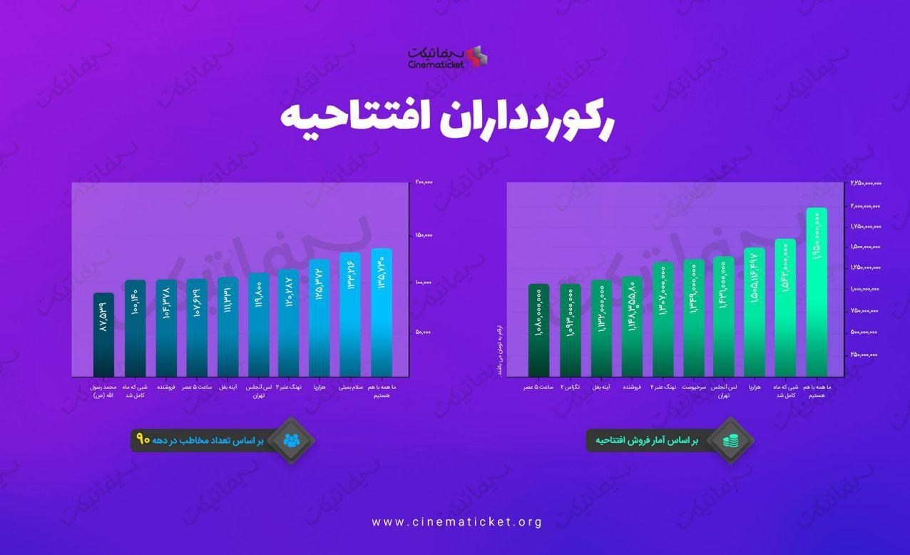 10 افتتاحیه پر فروش و پرمخاطب سینمای ایران در دهه 90 بدین شرح است:
