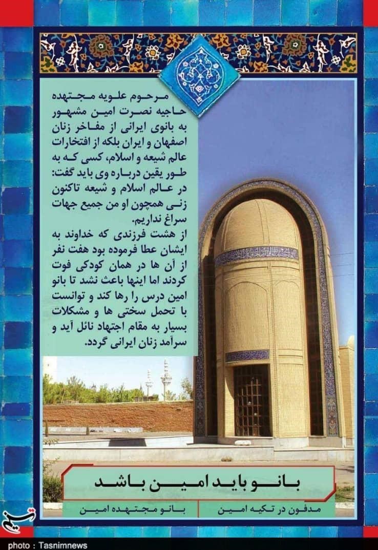 خبرگزاری تسنیم در ادامه سلسله گزارشهای ستارگان مدفون در تخت فولاد به بهانه سالروز وفات بانو مجتهده امین به معرفی این بانوی عالمه معروف به بانوی ایرانی پرداخت. عظمت مقام علمی این بانوی بزرگ به حدی رسید که علما و مفاخر اصفهان و دیگر شهرهای ایران و حتی خارج از ایران با شنیدن وصف ایشان، مشتاق دیدن این بانوی بزرگوار میشدند.