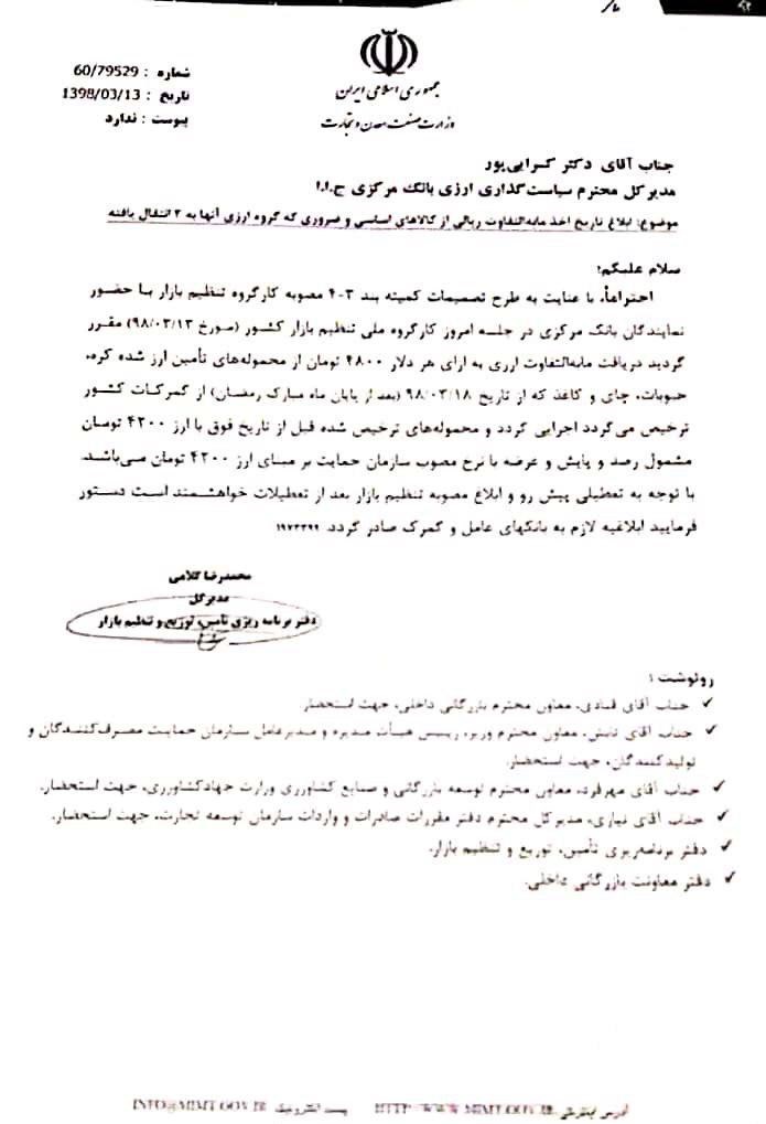 در این نامه آمده است: با عنایت به طرح تصمیمات کمیته بند 3-4 مصوبه کارگروه تنظیم بازار با حضور نمایندگان بانک مرکزی در جلسه 13 خرداد کارگروه ملی تنظیم بازار، مقرر شد دریافت مابهالتفاوت ارزی به ازای هر دلار 4800 تومان از محمولههای تامین ارز شده کره، حبوبات، چای و کاغذ که از تاریخ 18 خرداد (بعد از پایان ماه مبارک رمضان) از گمرکات کشور ترخیص میشوند، اجرایی گردد و محمولههای ترخیص شده تا قبل از تاریخ فوق الذکر با ارز 4200 مشمول رصد، پایش و عرضه با نرخ مصوب سازمان حمایت بر مبنای ارز 4200 تومانی میباشد.