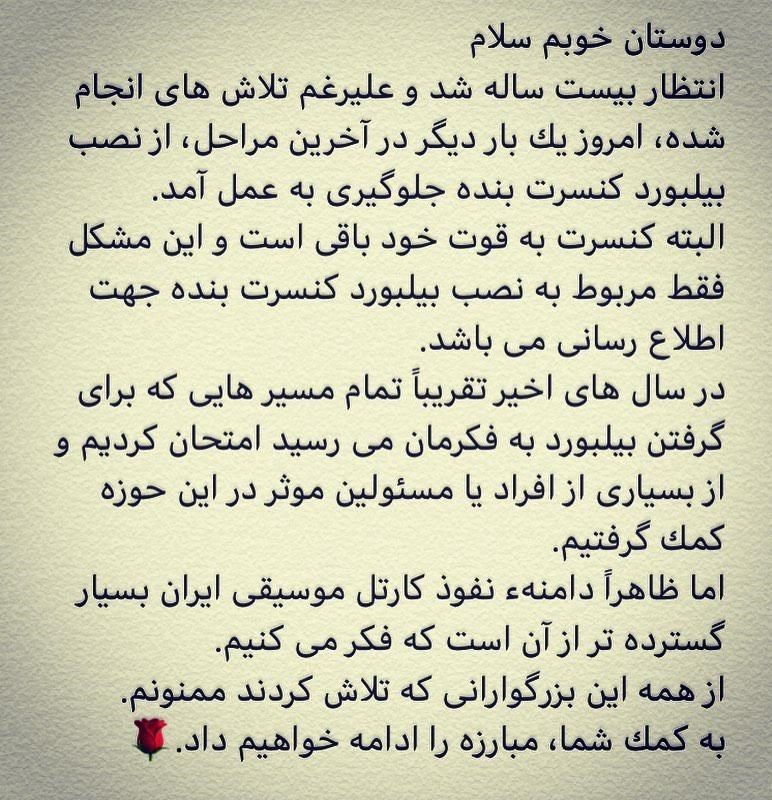 شاید زمان آن فرا رسیده که مسئولان وزارت ارشاد و البته مسئولان قضایی تحقیقاتی ویژه درباره صحبت‌های محمد معتمدی انجام دهند. چرا مافیایی در عرصه موسیقی تا این حد نفوذ دارد که بیلبوردهای سطح شهر را هم در اختیار دارد.