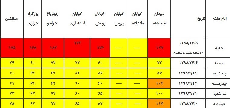 براساس اعلام این مرکز میانگین شاخص کیفی هوا در ایستگاه‌های میدان احمدآباد اصفهان 177، خیابان رودکی 176، خیابان استانداری 173، چهارباغ خواجو 183 و بزرگراه خرازی 165 ثبت شده است.