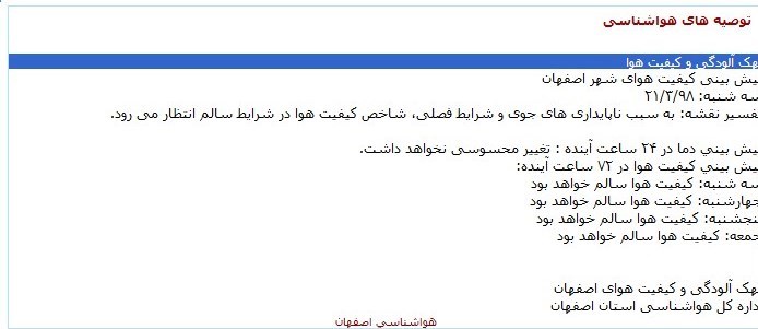 اما در بخش کیفیت هوای اصفهان در سایت اداره کل محیط زیست استان اصفهان آمار زیر قابل ارائه است: