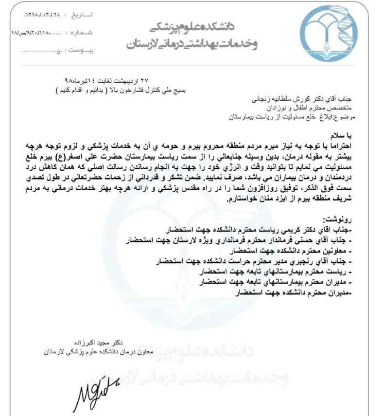وی تاکید می‌کند: اگر اقدامی برای تدوین و تصویب یک تفاهم نامه همکاری با بیمارستان لامرد که زیر مجموعه علوم پزشکی شیراز است، شده بود، بعد زمانی یک ساعت و نیمه بیرم - لار به فاصله 15 دقیقه بیرم-لامرد با این تفاهم نامه کاهش می‌یافت و حتماً جان بسیاری از بیماران از جمله نوزادان من حفظ می‌شد.