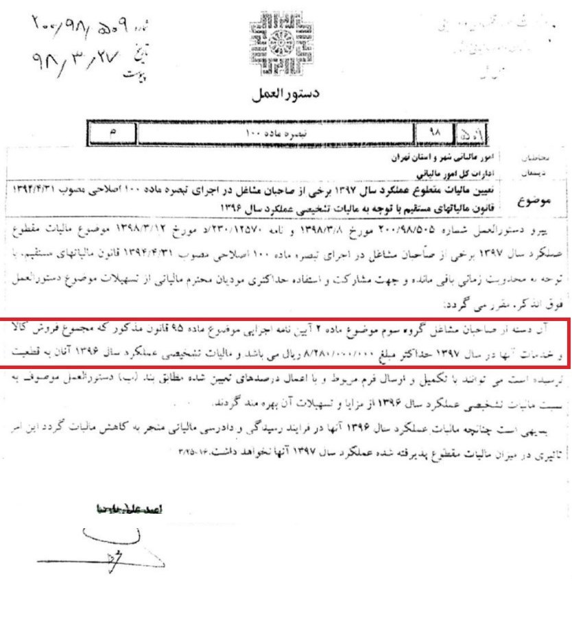 در این بخشنامه که از سوی رئیس سازمان امور مالیاتی ابلاغ شد آمده است؛ بر اساس دستورالعمل شماره 200/98/505 مورخ 98/3/8 و نامه 230/12570/د مورخ 1398/3/12 موضوع مالیات مقطوع عملکرد سال 1397 برخی از صاحبان مشاغل در اجرای تبصره ماده (100) اصلاحی مصوب 1394/4/31 قانون مالیاتهای مستقیم و با توجه به محدودیت زمانی باقیمانده و جهت مشارکت و استفاده حداکثری مؤدیان محترم مالیاتی از تسهیلات موضوع دستورالعمل فوق الذکر، آن دسته از صاحبان مشاغل گروه سوم موضوع ماده (2) آییننامه اجرایی موضوع ماده (95) قانون مذکور که مجموع فروش کالا و خدمات آنها در سال 1397، حداکثر مبلغ 828میلیون تومان است و مالیات تشخیصی عملکرد سال 1396 آنان به قطعیت نرسیده، میتوانند با تکمیل و ارسال فرم مربوط و با اعمال درصدهای تعیینشده مطابق بند (ب) دستورالعمل موصوف بهنسبت مالیات تشخیصی عملکرد سال 1396 از مزایا و تسهیلات آن بهرهمند شوند.