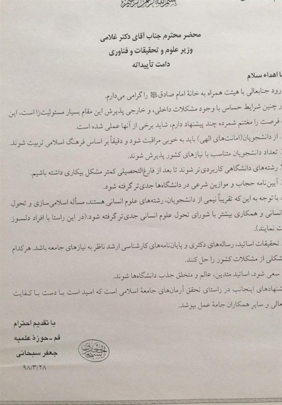 مرجع تقلید شیعیان در دیدار با وزیر علوم نامه سرگشاده‌ای به وی داد.