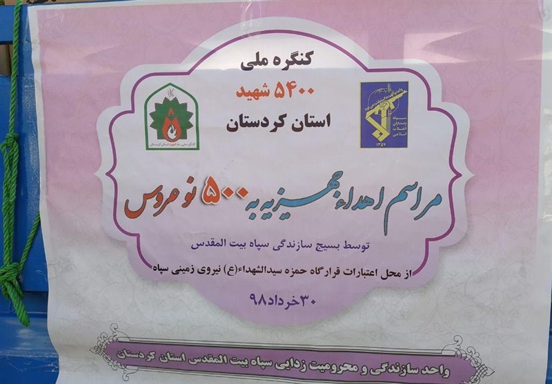به گزارش خبرگزاری تسنیم از سنندج، مراسم اهداء جهیزیه به 500 نوعروس نیازمند از سلسه برنامه‌های کنگره 5400 شهید کردستان صبح امروز با حضور سردار سرلشکر پاسدار حسین سلامی فرمانده کل سپاه پاسداران، فرماندهان ارشد سپاه، سردار محمدحسین رجبی فرمانده سپاه بیت‌المقدس استان کردستان، خانواده‌های آنان و اقشار مختلف مردم در این شهر برگزار شد.