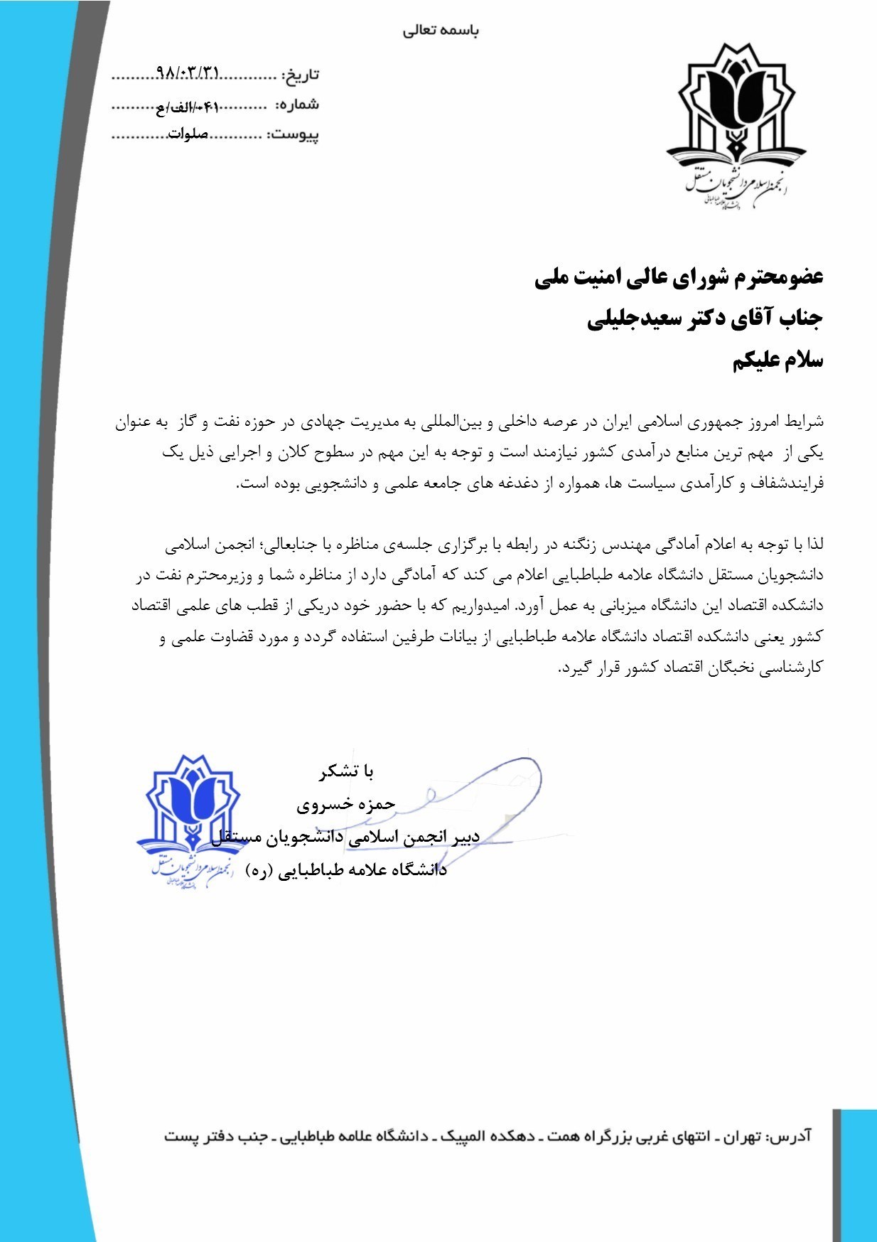 «شرایط امروز جمهوری اسلامی ایران در عرصه داخلی و بینالمللی به مدیریت جهادی در حوزه نفت و گاز به عنوان یکی از مهمترین منابع درآمدی کشور نیازمند است و توجه به این مهم در سطوح کلان و اجرایی ذیل یک فرایندشفاف و کارآمدی سیاست ها، همواره از دغدغههای جامعه علمی و دانشجویی بوده است؛ لذا با توجه به نامه جنابعالی در رابطه با برگزاری جلسهای جهت مناظره و رفع شبهات و مباحث مرتبط با وزارت نفت؛ انجمن اسلامی دانشجویان مستقل دانشگاه علامه طباطبایی اعلام میکند آمادگی دارد از مناظره شما و وزیرمحترم نفت در دانشکده اقتصاد این دانشگاه میزبانی به عمل آورد.