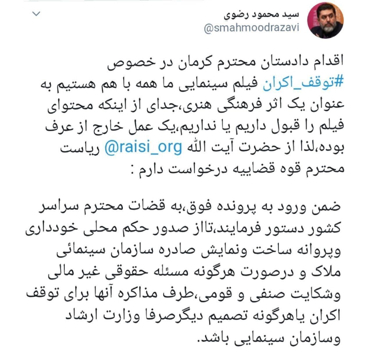 به گزارش خبرنگار فرهنگی خبرگزاری تسنیم، سید محمود رضوی تهیهکننده سینما با واکنش نسبت به توقف اکران فیلم «ما همه با هم هستیم» در صفحه شخصی خود این اقدام را یک عمل خلاف عرف عنوان کرد و از ریاست قوه قضائیه خواست که به این موضوع رسیدگی کند. وی در این توئیت عنوان کرد: