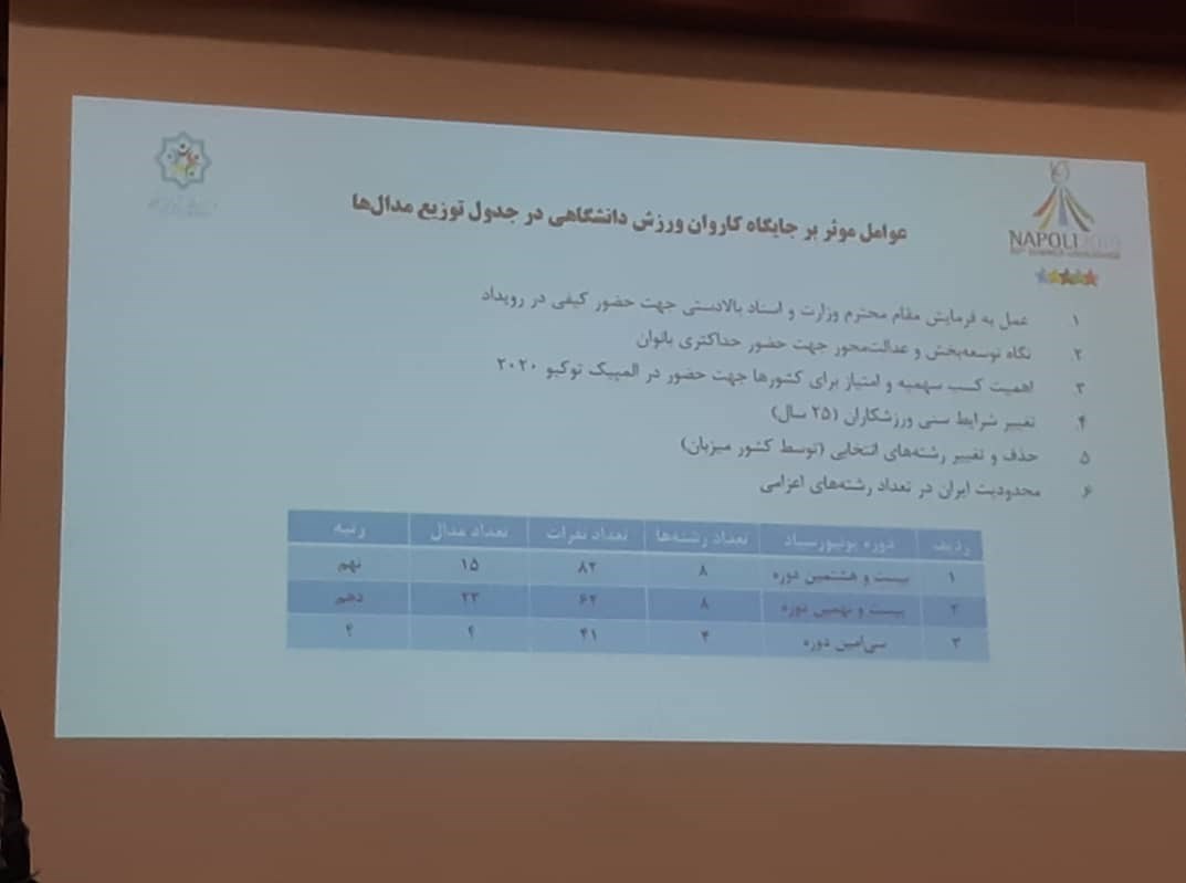 رئیس فدراسیون ورزشهای دانشگاهی در پایان با ارائه گزارشی به روند آماده سازی کاروان ایران در سیامین دوره یونیورسیاد و عوامل موثر در جایگاه کاروان ورزش دانشگاهی در جدول توزیع مدالها اشاره کرد.