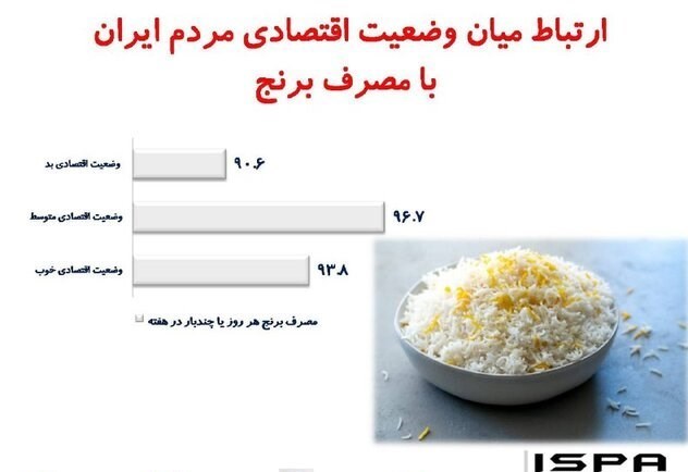 به گزارش گروه دانشگاه خبرگزاری تسنیم، بر اساس نظرسنجی ملی مرکز افکارسنجی دانشجویان ایران (ایسپا) که به منظور بررسی ارتباط میان وضعیت اقتصادی مردم با مصرف برنج در روزهای 31 اردیبهشت و 1 خرداد ماه 98 به صورت تلفنی با جامعه آماری شهروندان کل کشور (اعم از شهر و روستا) انجام شده است، از کل کسانی که وضع اقتصادی خود را "بد" ارزیابی کردهاند، 90.6 درصد گفتهاند هر روز یا چند بار در هفته برنج مصرف میکنند.