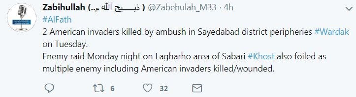«ذبیحالله مجاهد» سخنگوی طالبان نیز در توییتر خود نوشت: نظامیان آمریکایی در ولایت میدان وردک در شرق این کشور هدف حمله طالبان قرار گرفته و دو نظامی آمریکایی نیز کشته شدند.