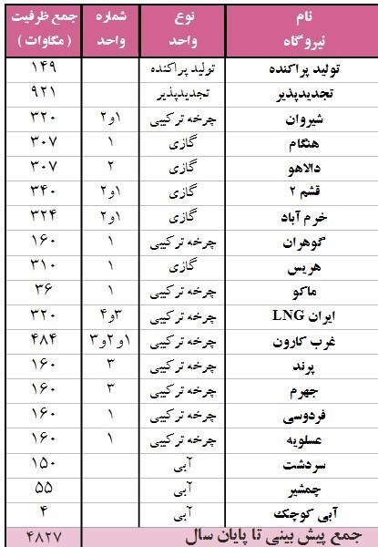 بررسی برنامه‌های مدیریت شبکه برق، سازمان ساتبا، شرکت مادرتخصصی برق حرارتی، شرکت مادرتخصصی توانیر و شرکت توسعه منابع آب و نیروی ایران نشان می‌دهد که پیش‌بینی شده تا پایان سال جاری شاهد بهره‌برداری از 4827 مگاوات ظرفیت جدید دیگر در بخش تولید برق کشور خواهیم بود که این ظرفیت‌های جدید که به‌تفکیک در جدول زیر آورده شده، در بخش‌های مختلف واحدهای حرارتی، تجدیدپذیر، برق‌آبی و تولید پراکنده خواهد بود.