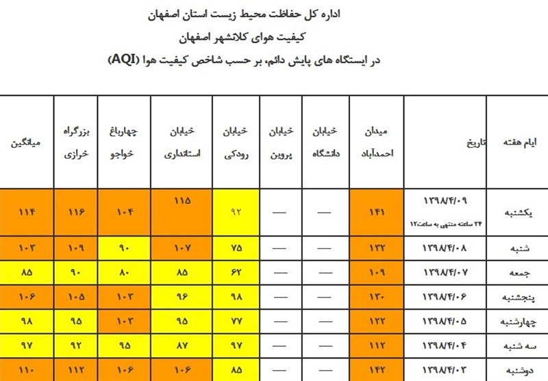 براساس این گزارش میانگین شاخص کیفیت هوا در شهر اصفهان 114 است و به این ترتیب اصفهان امروز هوایی ناسالم برای گروههای حساس دارد.