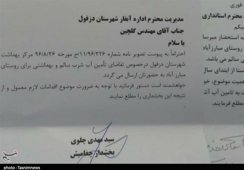 سلطانی گفت: سالها است که مردم روستای مبارزآباد از توابع بخش چغامیش دزفول از نعمت آب آشامیدنی محروم هستند و طبق گفته مسئولان بهداشت آب این روستا آلوده و غیرقابل استفاده است که این امر موجب بروز انواع بیماری پوستی و داخلی برای اهالی روستا میشود.