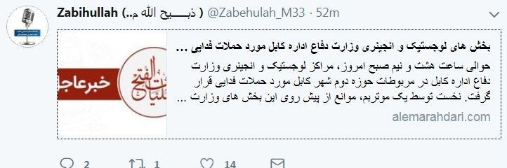پس از تقریبا گذشت یک ساعت «نصرت رحیمی» سخنگوی وزارت کشور افغانستان به رسانهها گفت: ریاست تدارکات وزارت دفاع افغانستان هدف حمله مهاجمان قرار گرفته است.