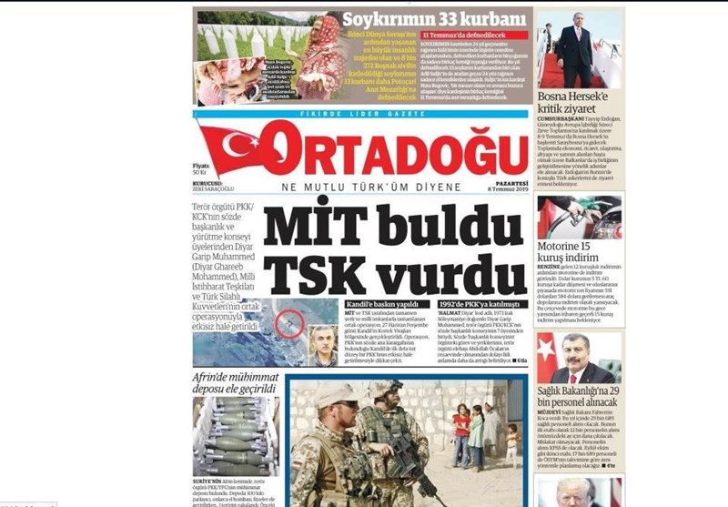 به گزارش گروه بینالملل خبرگزاری تسنیم، بسیاری از روزنامههای ترکیه، امروز در عکس و تیتر صفحه نخست، کشته شدن یکی از مسئولین رده بالای پ.ک.ک به نام دیار غریب را برجسته کردهاند.