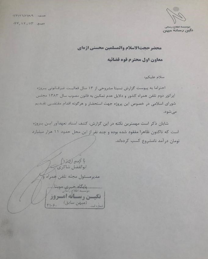به گزارش خبرنگار قضایی خبرگزاری تسنیم؛ در تاریخ 15 اسفند سال 93، گزارشی تحت عنوان «فعالیت غیرقانونی پروژه اپراتور دوم تلفن همراه کشور» به حجتالاسلام والمسلمین غلامحسین محسنی اژهای معاون اول قوهقضائیه ارسال میشود که معاون اول دستگاه قضا، گزارش واصله را برای رسیدگی به دادستانی تهران ارجاع میدهد.