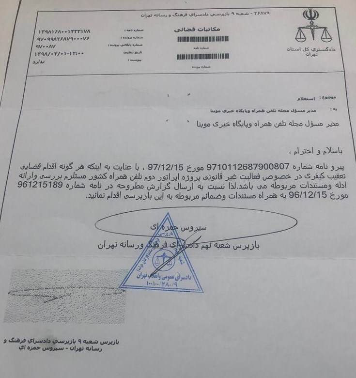 پس از ارجاع گزارش از سوی معاون اول قوهقضائیه به دادستانی تهران و مطالعه اسناد واصله، گزارش مزبور برای رسیدگی به شعبه نهم بازپرسی دادسرای فرهنگ و رسانه ارجاع میشود که اخیراً بازپرس پرونده به فردی که گزارش را به معاون اول قوهقضائیه ارائه کرده بود، طی نامهای اعلام کرده است: « پیرو نامه شماره 9710112687900807 مورخ 15 اسفند 97، با عنایت به اینکه هرگونه اقدام قضایی تعقیب کیفری در خصوص فعالیت غیرقانونی پروژه اپارتور دوم تلفن همراه کشور، مستلزم بررسی و ارائه ادله و مستندات مربوطه است لذا نسبت به ارسال گزارش مطروحه در نامه شماره 961215189 مورخ 15 اسفند سال 96 به همراه مستندات و ضمائم مربوطه به این بازپرسی اقدام کنید.